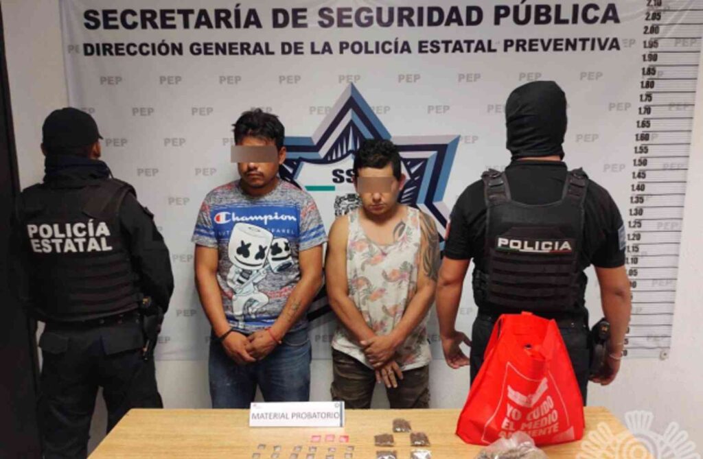 Agentes de la Policía Estatal detuvieron en inmediaciones de la colonia Guadalupe Hidalgo, a dos presuntos distribuidores de droga identificados como César L. y Álvaro L. de 36 y 33 años.