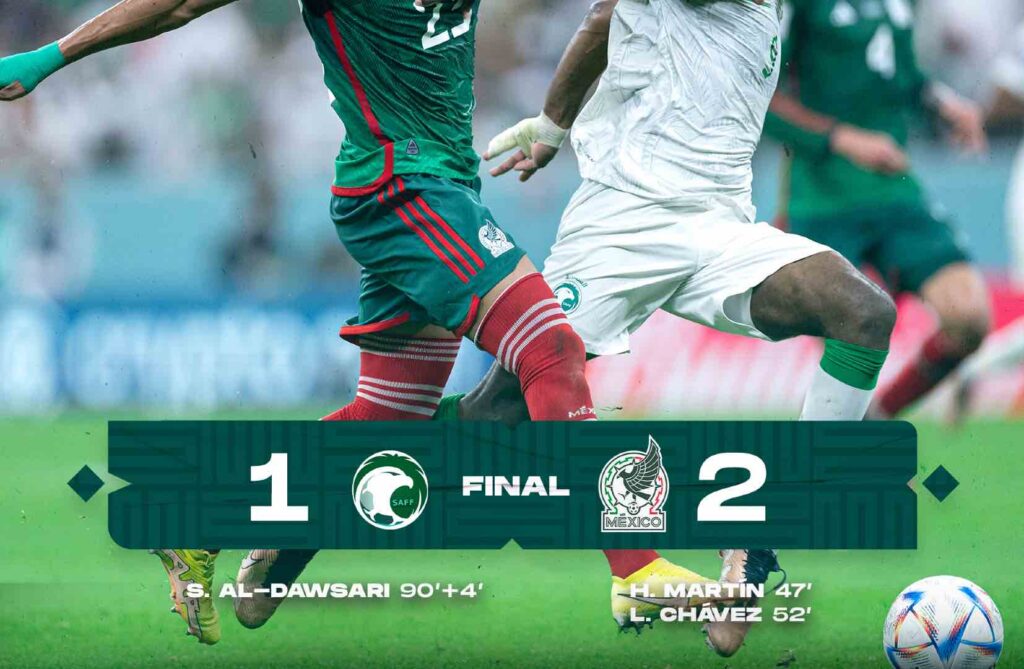 Los goles del cuadro mexicano fueron obra de Henry Martin al minuto 47 y Luis Chávez a 52’. Por Arabia Saudita anotó Salem Al-Dawsari al 90+5.