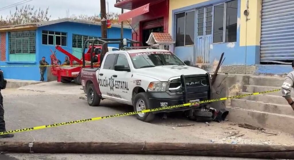 El accidente ocurrió cerca de una tienda de abarrotes y provocó que el vehículo policial también derribara un poste de la Comisión Federal de Electricidad (CFE).