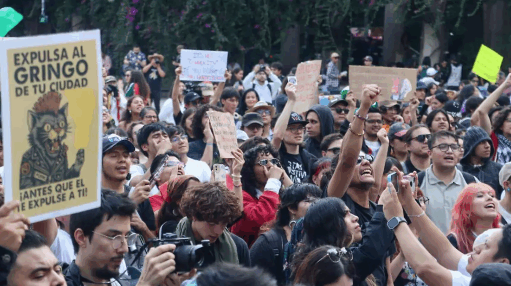 Con pancartas y consignas como “¡Esta es mi casa, no es tu casa!” y “No hablaré inglés para tu comodidad”, los manifestantes partieron del Parque México, en la alcaldía Cuauhtémoc, y recorrieron restaurantes frecuentados por visitantes extranjeros, principalmente de origen estadounidense y europeo, hasta llegar al Ángel de la Independencia.