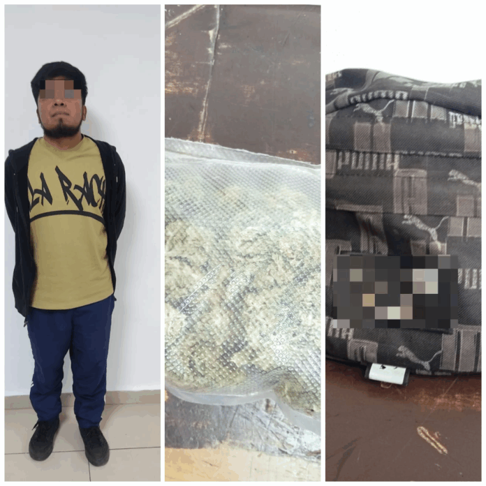 Los hechos ocurrieron en la avenida México-Puebla cuando un masculino de nombre Juan Carlos “N”. de 23 años de edad, ofendió verbalmente a los uniformados y al realizarle la revisión de protocolo le encontraron la posible droga en una mochila tipo mariconera.