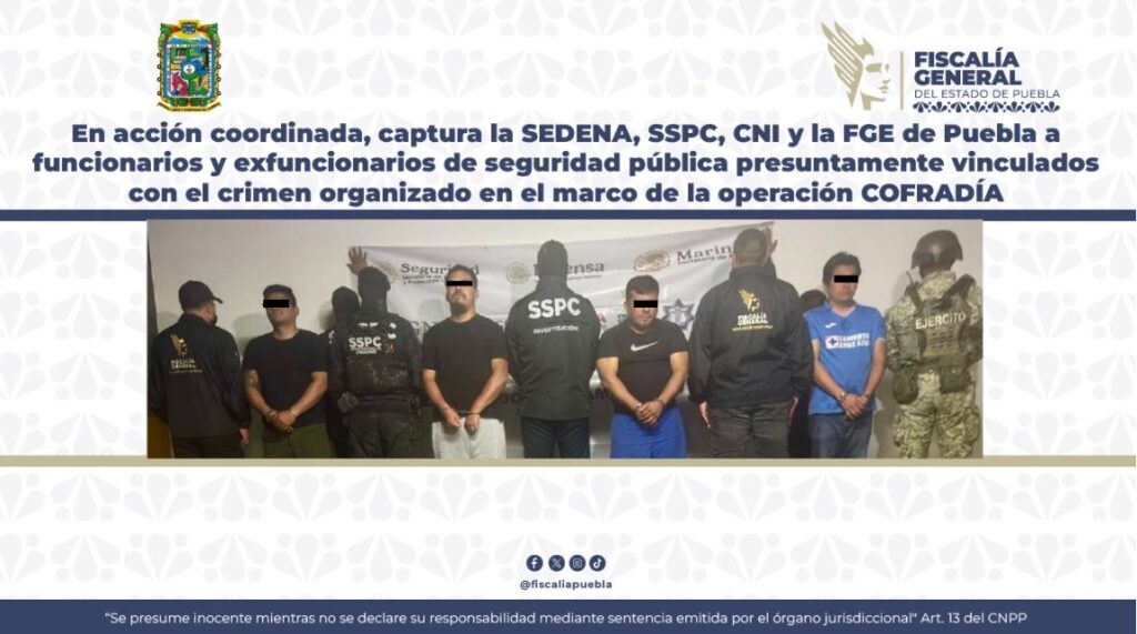 En el marco de la operación COFRADÍA, la Secretaría de la Defensa Nacional (SEDENA), la Secretaría de Seguridad y Protección Ciudadana (SSPC) Federal y el Centro Nacional de Inteligencia, en estrecha coordinación con la Fiscalía General del Estado de Puebla (FGE), ejecutaron un despliegue estratégico para desarticular una red de infiltración del crimen organizado en estructuras de seguridad pública, aprehendiendo a exfuncionarios y funcionarios en activo de seguridad pública.
