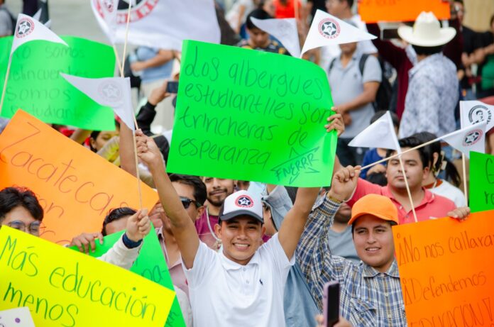 La protesta se desarrolló en la Alameda de León, donde los jóvenes arribaron para realizar una jornada cultural para visibilizar su lucha y exigir justicia y respeto a los albergues estudiantiles, así como la intervención del gobernador Salomón Jara para dar solución a esta problemática.