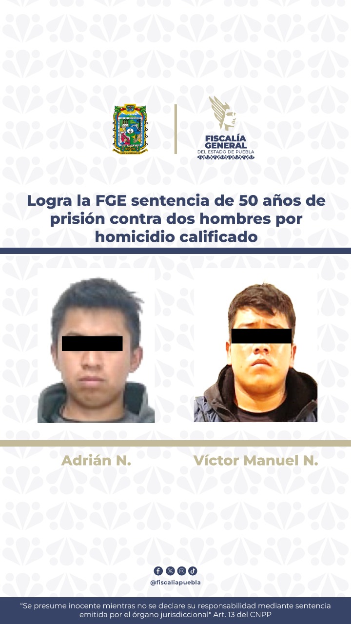 La Fiscalía General del Estado de Puebla, a través del trabajo realizado por el agente del Ministerio Público, logró obtener una sentencia de 50 años de prisión en contra de Adrián N. y Víctor Manuel N., al acreditar su responsabilidad penal en la comisión del delito de homicidio calificado.