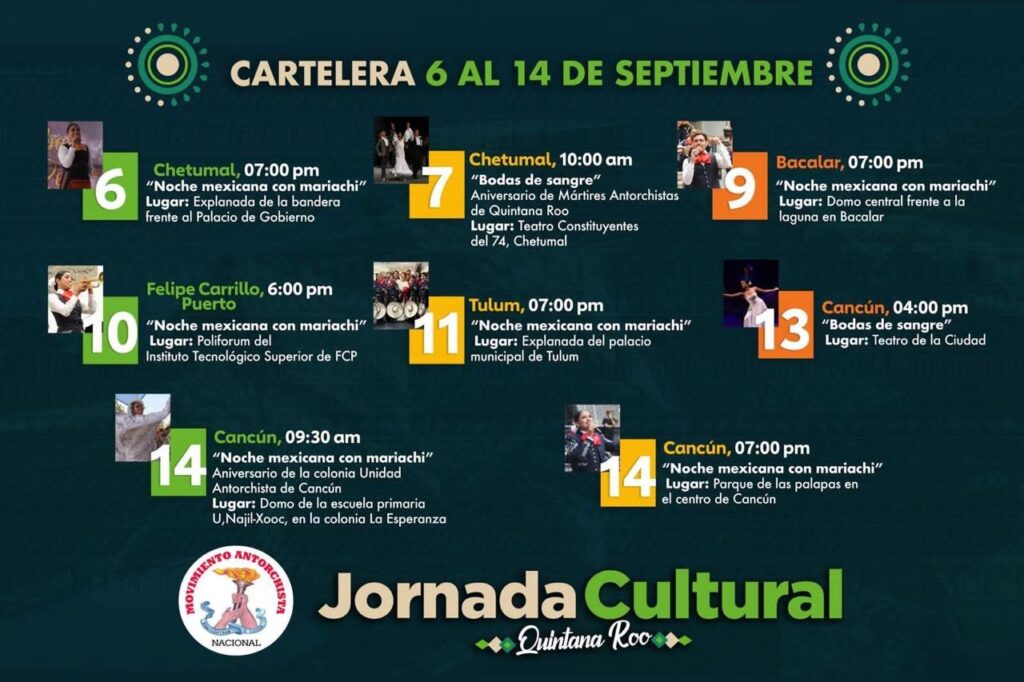 El primer evento se llevará a cabo este sábado 6 de septiembre en la Explanada de la bandera frente al Palacio de Gobierno de Chetumal, Quintana Roo, y en redes sociales podrán seguir la cobertura completa del evento, a través de la página en Facebook: Grupos Culturales Nacionales del Mov Antorchista