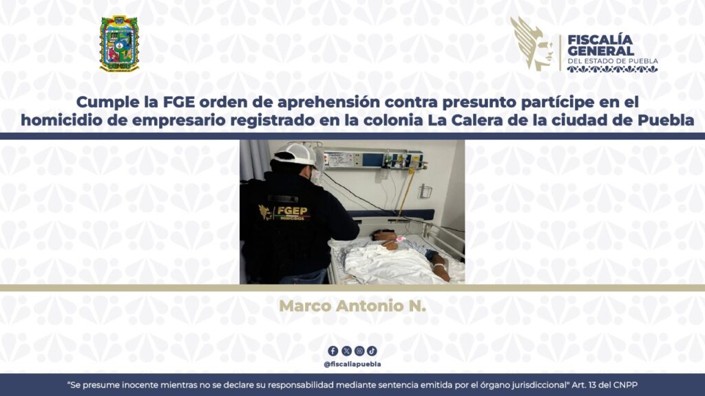 La Fiscalía General del Estado de Puebla informa que como resultado de actos de investigación se logró identificar y detener a Marco Antonio N., por su probable participación en el homicidio de un empresario ocurrido el pasado 1 de septiembre en la colonia Bosques de La Calera de la ciudad de Puebla.