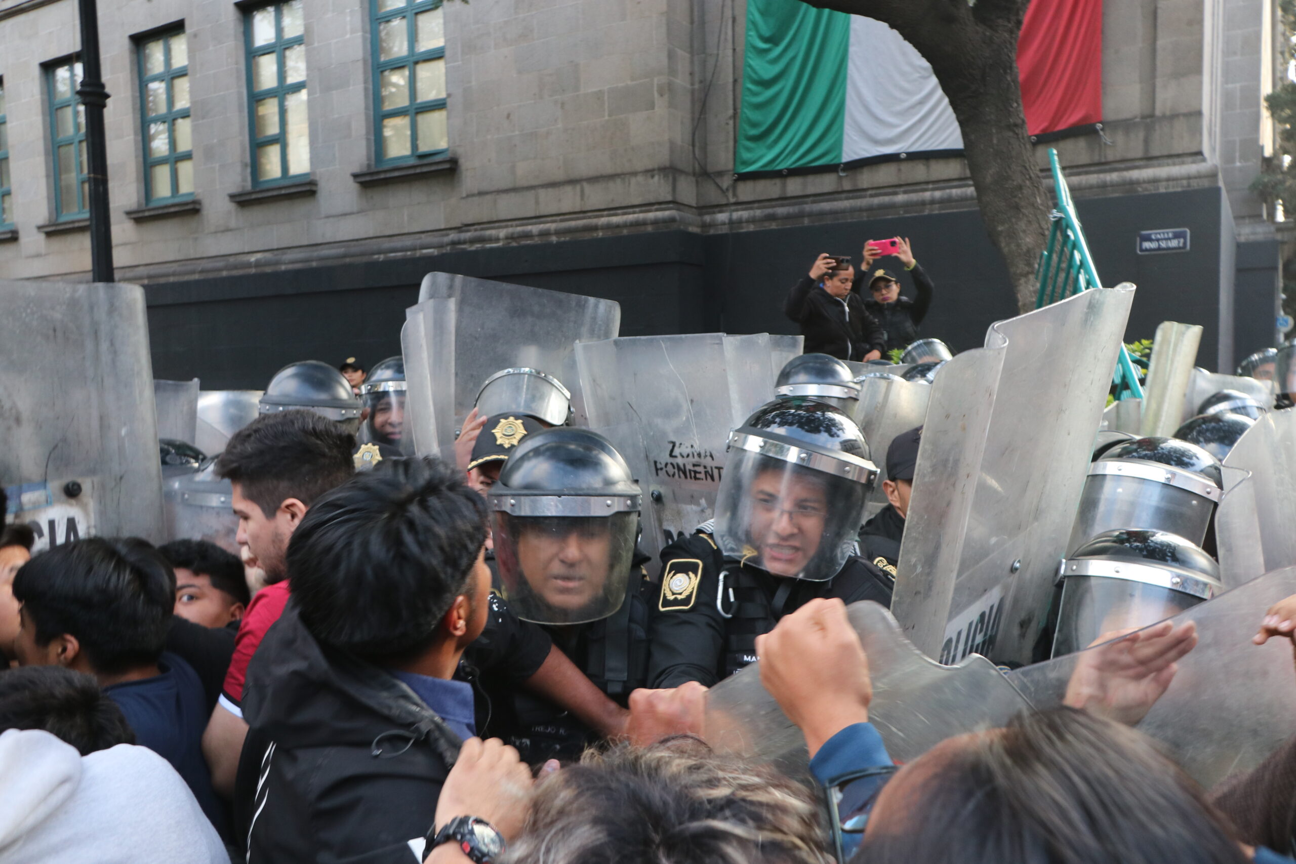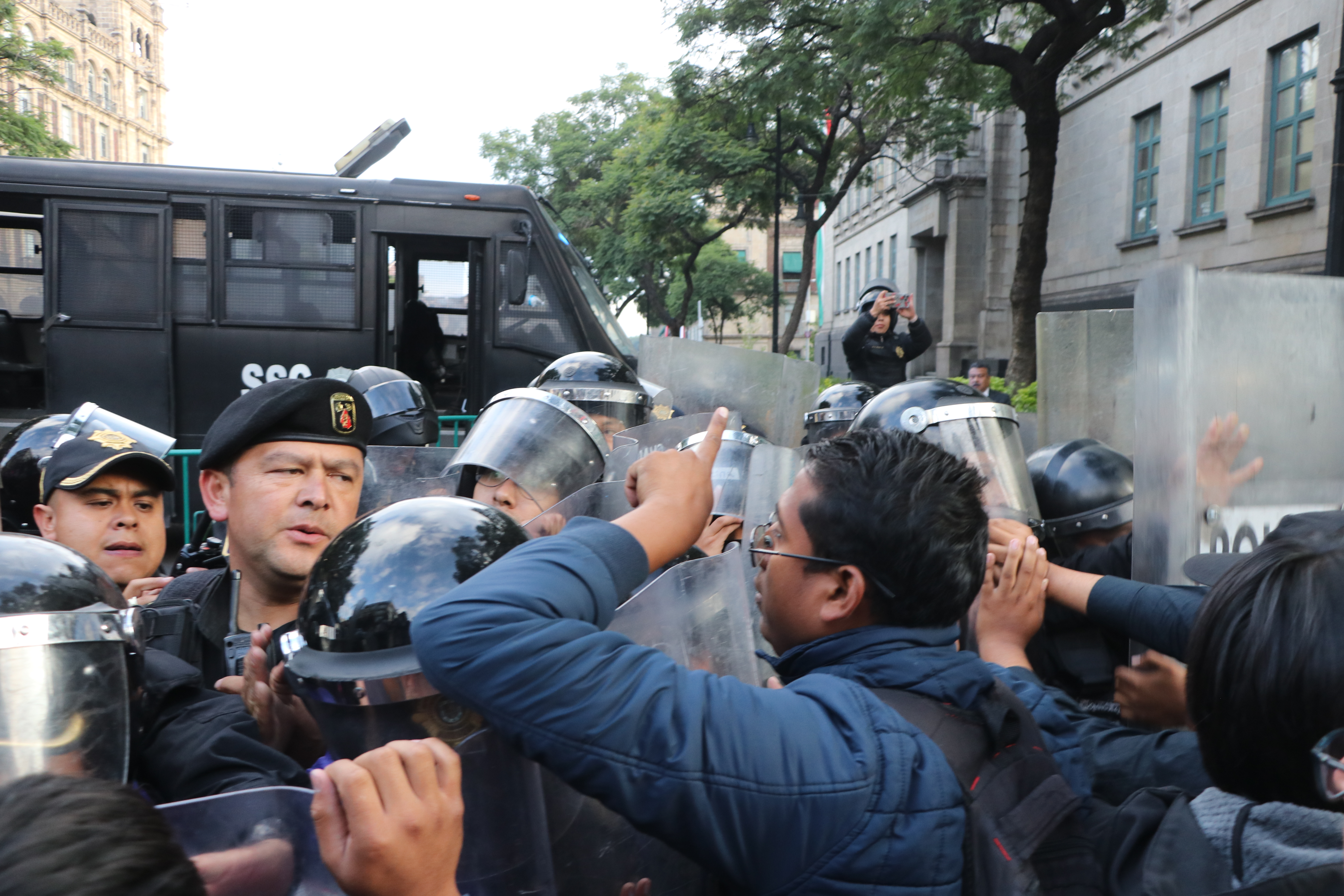 Elementos de la policía, con cascos, escudos y extintores, empujaron y forcejearon con los estudiantes y padres de familia para impedir su acceso a la Plaza de la Constitución.