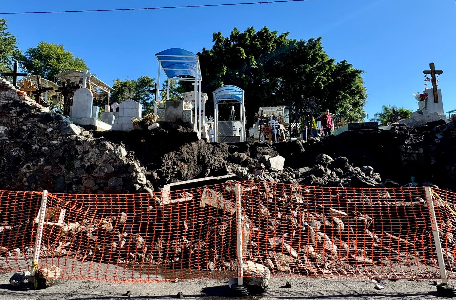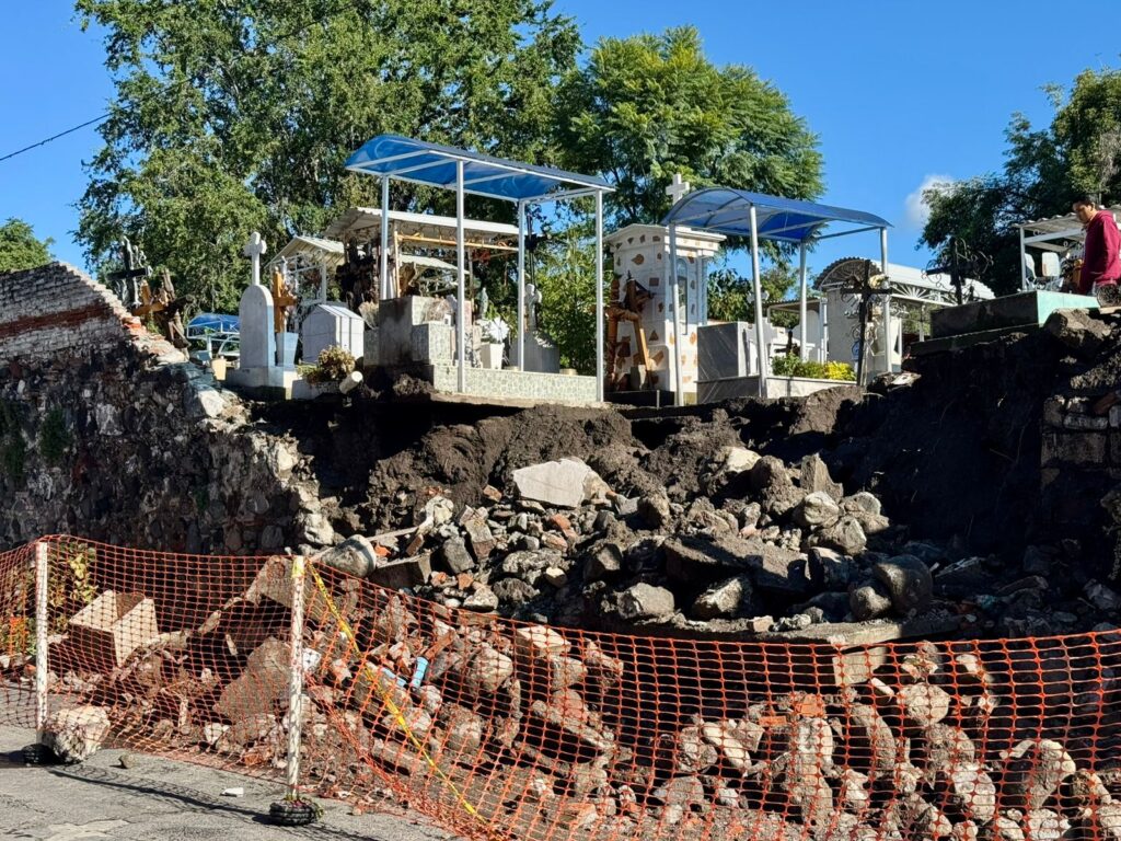 El hecho más grave ocurrió en el Panteón Municipal, donde la barda perimetral colapsó, dejando al descubierto varias tumbas y arrastrando tierra y escombros hacia la Avenida Manuel Ávila Camacho.