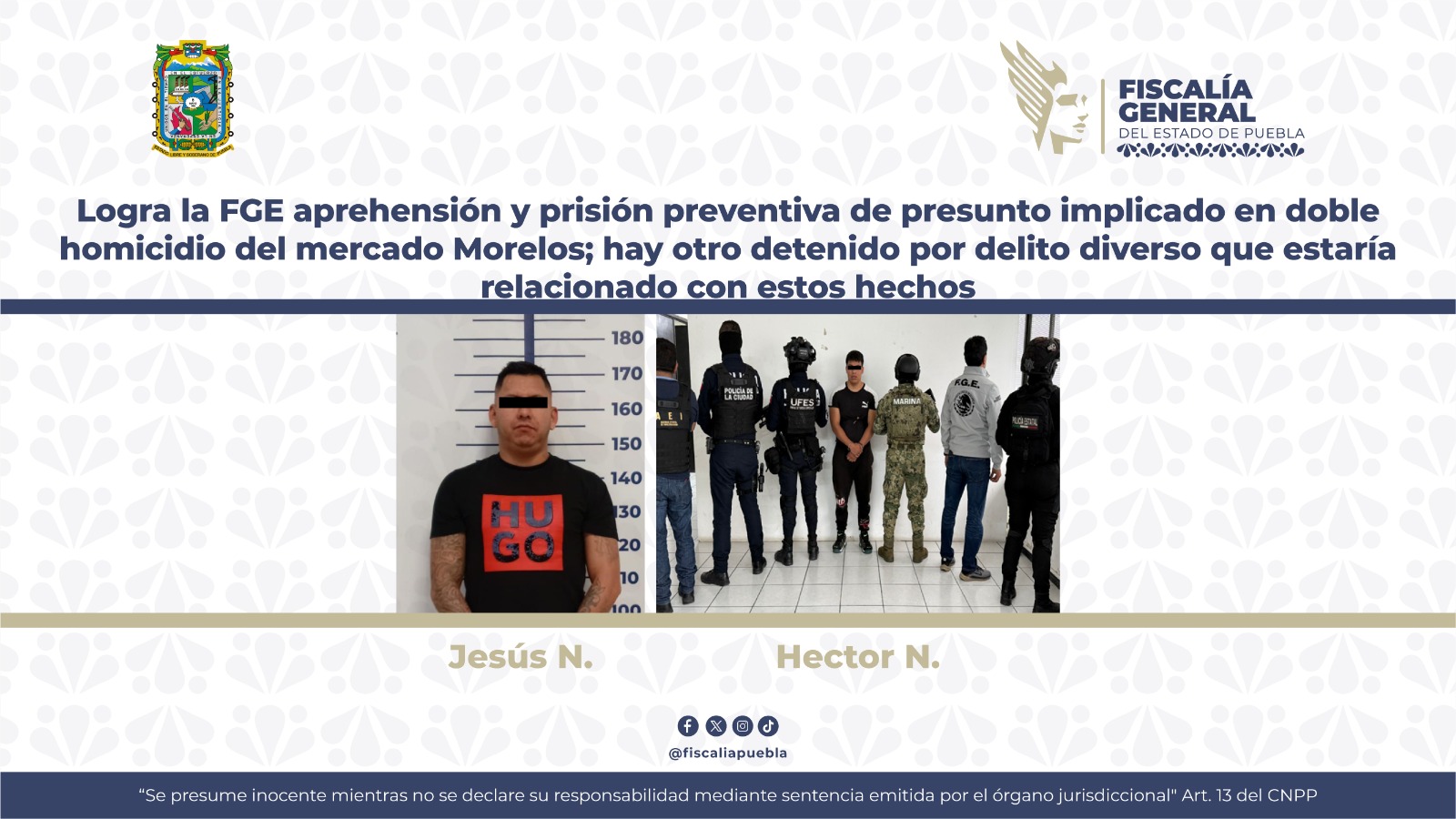 La Fiscalía General del Estado de Puebla, con apoyo de las Secretarías de Marina (SEMAR) y Seguridad Ciudadana de Puebla (SSC), cumplimentó una orden de aprehensión en contra de Héctor N., quien se encuentra con prisión preventiva tras presuntamente estar implicado en el homicidio de dos personas cuyos cuerpos fueron localizados en el Centro de la ciudad de Puebla; además hay otro detenido por un delito diverso, mismo que también estaría relacionada con estos hechos.
