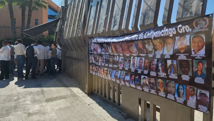 Chilpancingo, Guerrero. Con pancartas y lonas, colectivos de desplazados por la violencia y familiares de personas desaparecidas se manifestaron en el Palacio de Gobierno en demanda de una reunión con autoridades estatales, con el fin de revisar las demandas pendientes.
