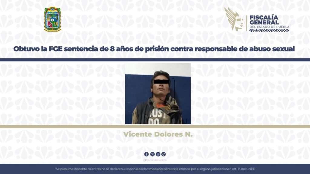 La Fiscalía General del Estado logró mediante la aportación de diversas pruebas, una sentencia de 8 años de prisión contra Vicente Dolores N., acusado del delito de abuso sexual, en agravio de un menor de 7 años.