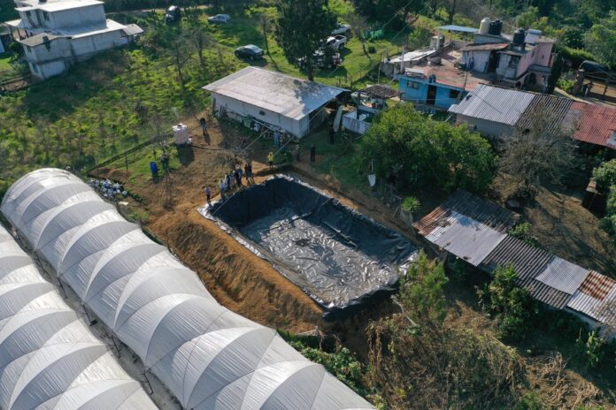 Cada una de las geomembranas tiene capacidad para contener 400 mil litros de agua, se calcula que beneficiará a 100 agricultores, dedicados a la siembra de frutos rojos.