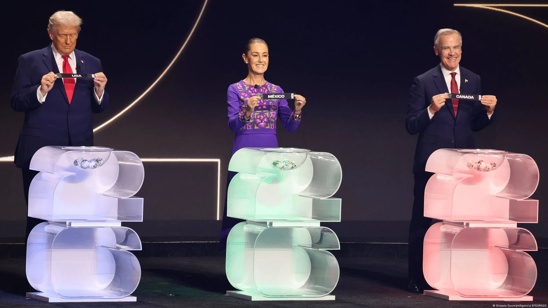 Los presidentes de Estados Unidos Donald Trump y de México Claudia Sheinbaum junto al primer ministro de Canadá Mark Carney participaron en la ceremonia del sorteo del Mundial 2026 celebrada en Washington como anfitriones del torneo.