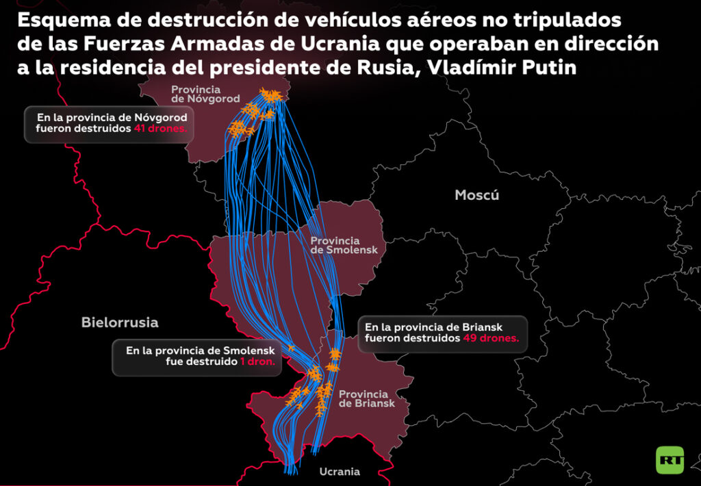 A finales de diciembre, el ministro de Relaciones Exteriores de Rusia, Serguéi Lavrov, informó que el régimen de Kiev intentó perpetrar un atentado terrorista con 91 vehículos aéreos no tripulados de largo alcance contra una residencia oficial del presidente, situada en la provincia de Nóvgorod. Los drones fueron derribados por sistemas de defensa antiaérea rusa.