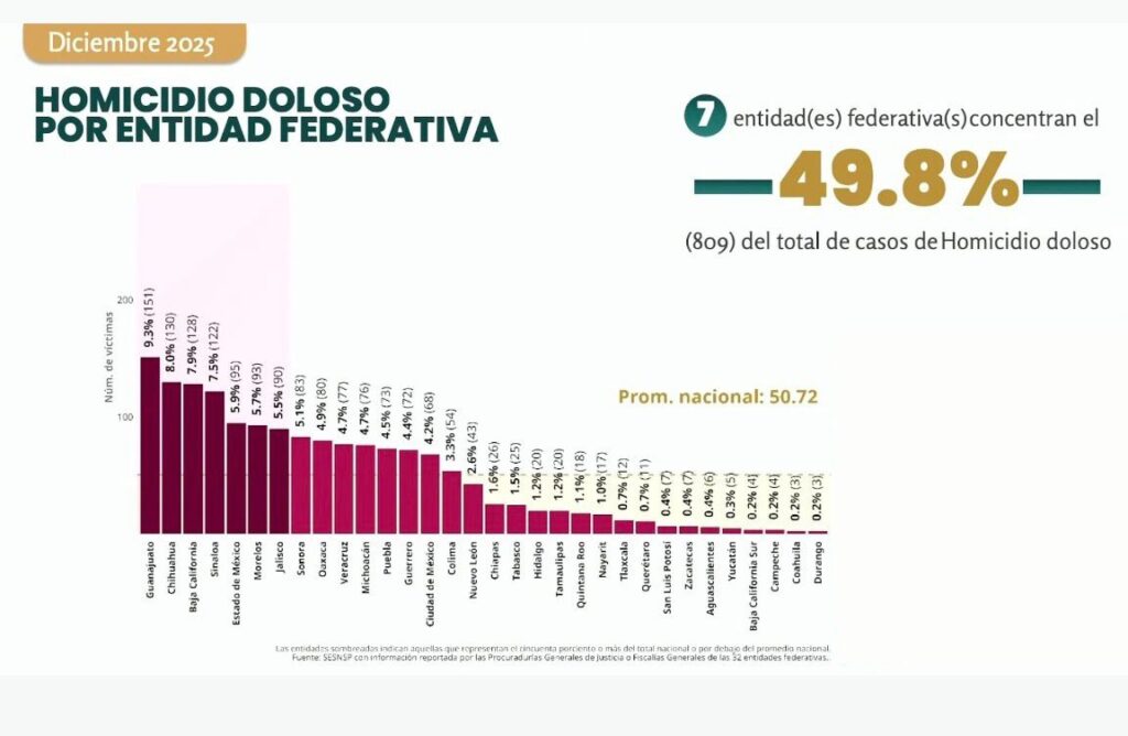 Xalapa, Veracruz. Durante el periodo de septiembre a diciembre de 2025, el estado de Veracruz aparece en el «top 10» de concentración de asesinatos, informó la titular del Secretariado Ejecutivo del Sistema Nacional de Seguridad Pública (SESNSP), Marcela Figueroa Franco, esto como resultados del programa de seguridad implementados a nivel nacional.