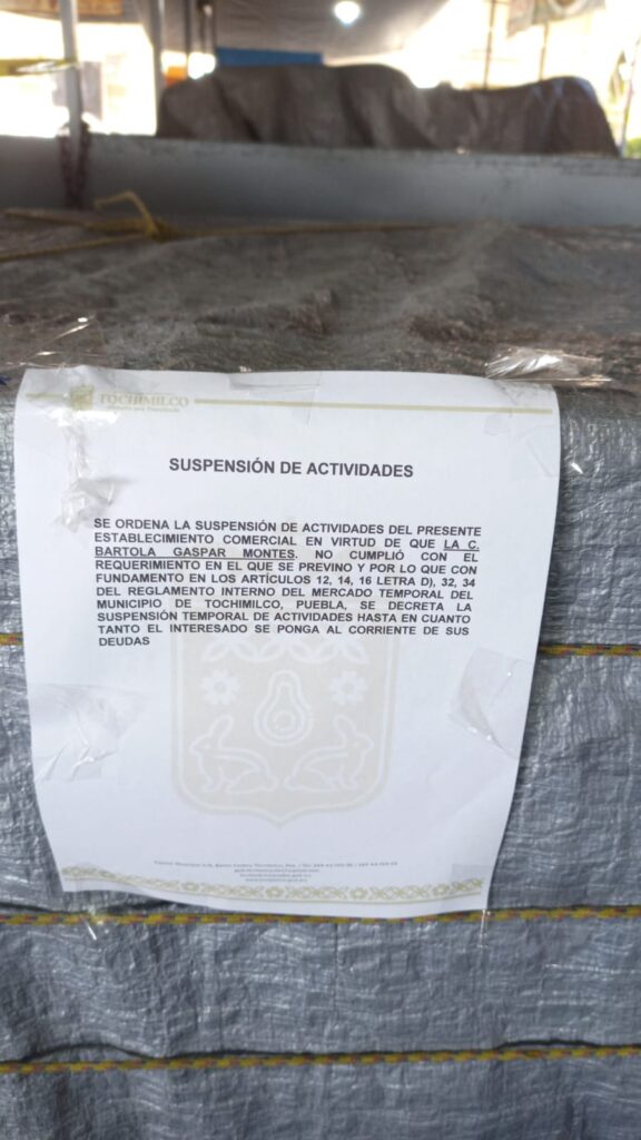 “Se decreta la suspensión temporal de actividades hasta en cuanto tanto el interesado se ponga al corriente de sus deudas”, fundamentando la decisión en diversos artículos del Reglamento Interno del Mercado Temporal del Municipio de Tochimilco, Puebla.