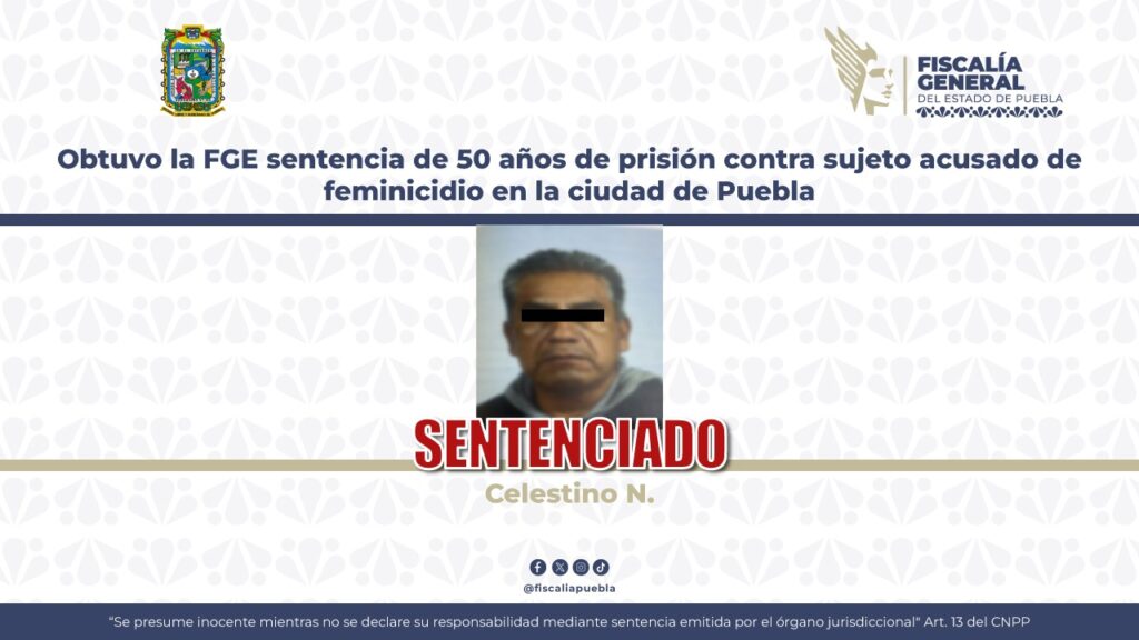La Fiscalía General del Estado informa que, como resultado del trabajo jurídico y científico realizado por la institución, se logró que la autoridad judicial emitiera una sentencia de 50 años de prisión en contra de Celestino N., por el delito de feminicidio en agravio de su pareja sentimental.
