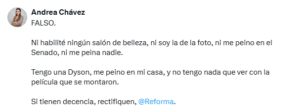 La senadora Andrea Chávez Treviño rechazó de manera contundente la información publicada por el diario Reforma en la que, de acuerdo con la legisladora sin «sustento alguno», se le atribuye la habilitación y uso de un supuesto salón de belleza al interior del Senado de la República.