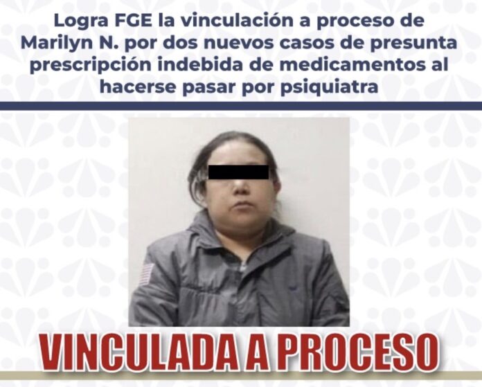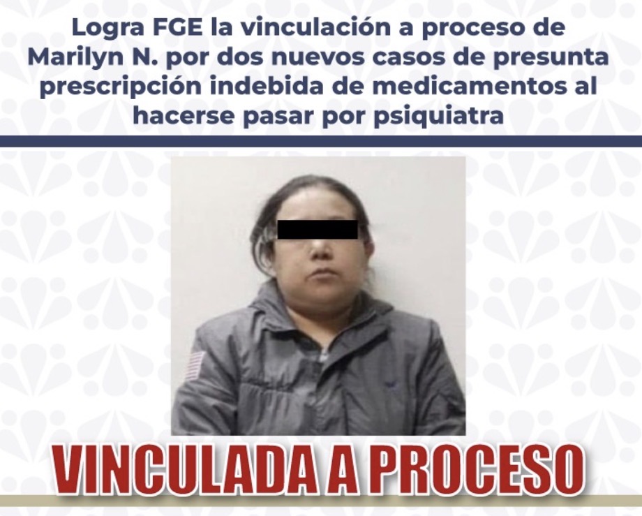 Cholula, Puebla. La Fiscalía General del Estado de Puebla informó que Marilyn N. fue vinculada a proceso por dos nuevos casos en los que presuntamente proporcionó atención psiquiátrica y recetó medicamentos controlados haciéndose pasar por psiquiatra, por lo que enfrenta cargos por el delito de usurpación de funciones.