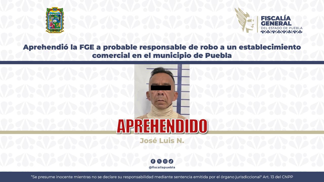 La Fiscalía General del Estado dio cumplimiento a la orden de aprehensión en contra de José Luis N., de 45 años de edad, por su probable responsabilidad en el delito de robo agravado a comercio, ocurrido en el municipio de Puebla.