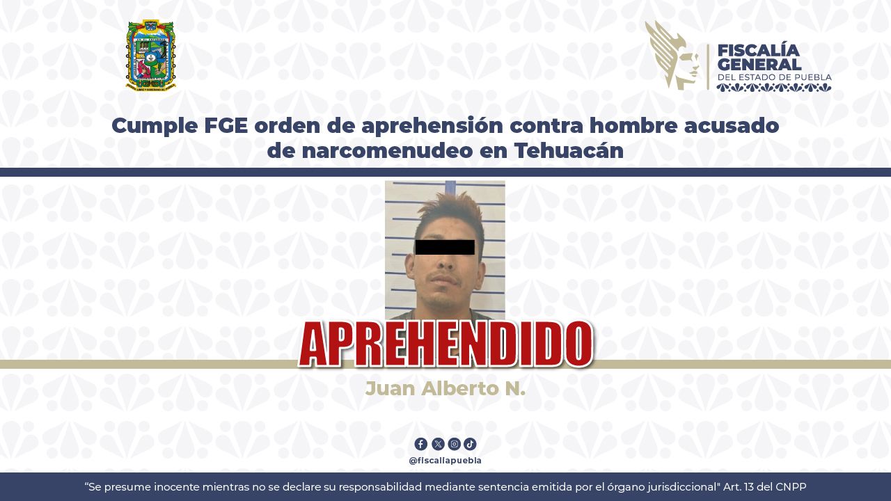 La Fiscalía General del Estado de Puebla (FGE) dio cumplimiento a una orden de aprehensión en contra de Juan Alberto N., alias “El Payaso”, de 26 años de edad, como probable responsable del delito contra la salud en su modalidad de narcomenudeo con fines de suministro de los narcóticos denominados marihuana y metanfetamina, por hechos registrados en el municipio de Tehuacán.