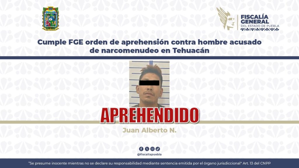 La Fiscalía General del Estado de Puebla (FGE) dio cumplimiento a una orden de aprehensión en contra de Juan Alberto N., alias “El Payaso”, de 26 años de edad, como probable responsable del delito contra la salud en su modalidad de narcomenudeo con fines de suministro de los narcóticos denominados marihuana y metanfetamina, por hechos registrados en el municipio de Tehuacán.