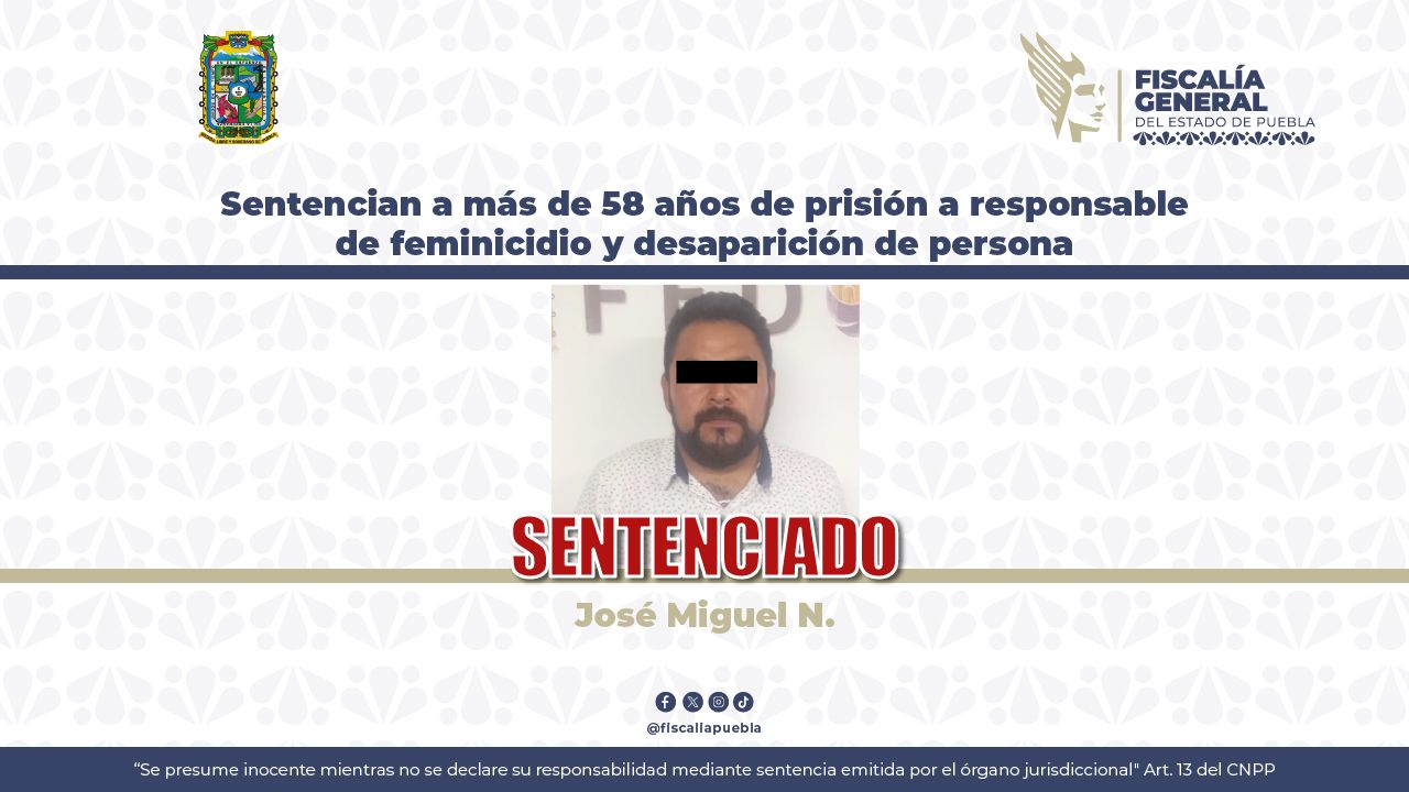 Tras el desahogo del proceso penal, la Fiscalía General del Estado de Puebla (FGE) obtuvo sentencia condenatoria contra José Miguel N., responsable de los delitos de feminicidio y delitos vinculados con la desaparición de persona, por hechos ocurridos en el municipio de Guadalupe Victoria.